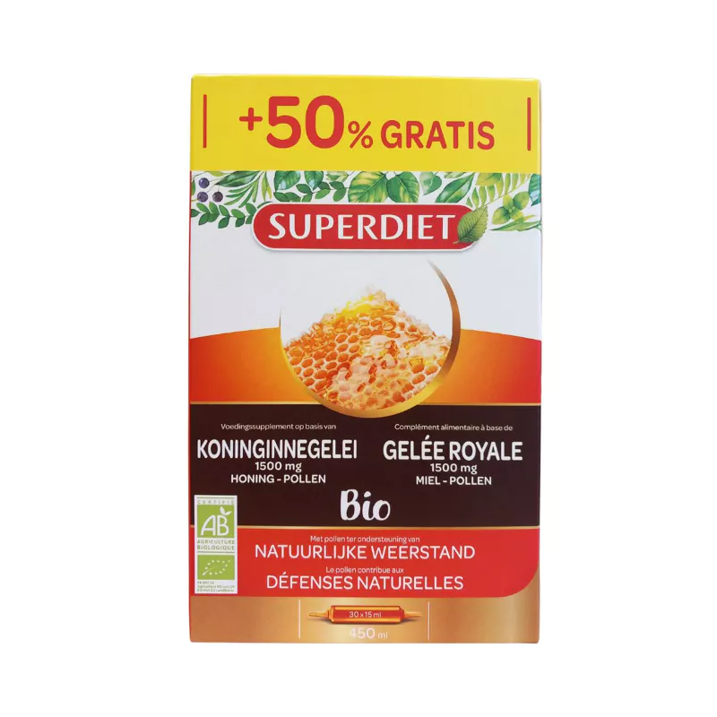 Gelée Royale 1500 mg Miel Pollen Bio 20 ampoules + 50% gratis